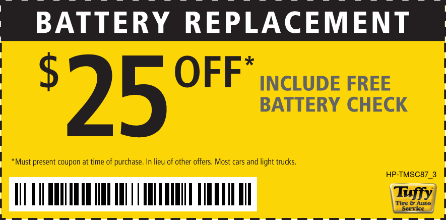 Good only atTuffy Auto Bourbonnais Expires 04/15/26 Schedule Service Print coupon Share to Google Offer details Battery Replacement $25 OFF (Includes FREE Battery Check) * See coupon for exclusions. Email Coupon First name * Last name * Email address * Sign me up to receive future offers via text from Tuffy Bourbonnais : Via Text Cell/Mobile Phone By clicking "I accept" below, I expressly agree to receive marketing text messages made by or on behalf of Tuffy Bourbonnais to the telephone number(s) I’ve listed above. I understand that I may receive such text messages by the use of Automatic Telephone Dialing Systems (including “Predictive Dialers” or “Autodialers”) and I agree to receive them even if I have registered my number(s) with my state or federal Do-Not-Call list(s). I understand that such text messages will include advertising containing offers for goods or services and that I may revoke this consent at any time by telephone, return text message or by Visiting tuffyautocare.com/stop to unsubscribe. Message and data rates may apply. I also understand that I am NOT required to provide this consent as a condition of purchasing goods or services. I accept View: Text Specials Terms and Conditions with this link.